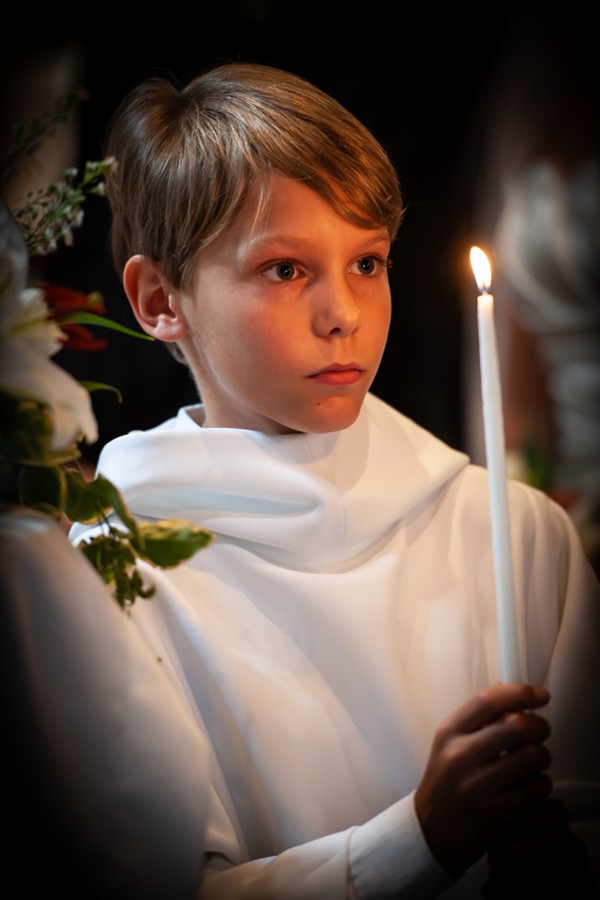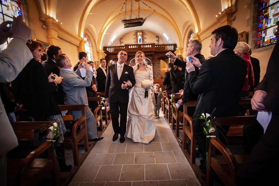 Selon le protocole, le futur marié entre au bras de sa maman vous le précédez jusqu’au coeur en faisant un maximum d’images des vues en pied et en plan large intégrant les invités. mode autofocus bien sûr et flash ou pas à vous de voir. Vous aurez au préalablement convenu avec la mariée et son père de vous attendre avant d’entrer. Les enfants s’affairent autour de la traîne, le voile s’abaisse sur le visage de la mariée, instants magiques à saisir. A nouveau, vous précédez les arrivants avec quelques mètres d’avance plans en pied au 70mm puis accroupi au 24mm en contre plongée pour donner de l’ampleur, à la scène, un flot d’image vous arrive dans le viseur, vous vous retournez, au bout de l’allée le futur attend et voit sa future arrivée, portraits hauteur, puis précipitez vous derrière l’accueillant, vous êtes au 24 ou 28mm car vous devez impérativement intégrer dans l’image ces trois personnes: le marié accueillant sa futur épouse et son père. Le dernier regard d’un père pour sa fille qui très ému se souvient. . . Doublez, triplez vos images ne comptez plus, vous ne pouvez en aucun cas manquer ces instants d’émotion. Le prêtre officiant vous regarde d’un sale oeil car vous n’êtes pas suffisamment discret, méfiance, vous le retrouverez très certainement à une prochaine cérémonie, il ne vous aura pas oublié...