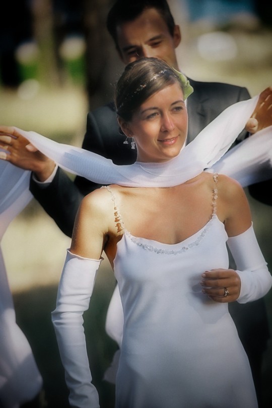 Deux boitiers avec grip pour le cadrage vertical, l’un équipé d’un zoom 24-70/2,8 l’autre d’un 70-210/2,8. Vous aurez besoin d’une plage focale de 24 à 200mm disponible immédiatement pour ne manquer aucune image de l’évènement. Les règlages d'appareil sont assez simple: priorité ouverture pour maîtriser la zone de netteté (profondeur de champ). Les ISO automatiques, pourquoi pas...Fichiers jpg pour le reportage mais RAW sûrement pour les portraits. Eventuellement un 18mm peut donner en intérieur comme en extérieur des images spectaculaires.. . Vous ne pouvez tomber en panne de matériel donc ces deux boitiers sont indispensables. Un flash cobra parfaitement dédié, n’oubliez pas que la lumière flash frontale casse les ombres donnant des images plates. . .aujourd’hui grâce au numérique, vous avez suffisamment d’ISO disponibles pour vous en passer, donc à utiliser qu’en cas de nécessité absolu. Cartes numériques à profusion, batteries de secours, chiffon optique de nettoyage . . .